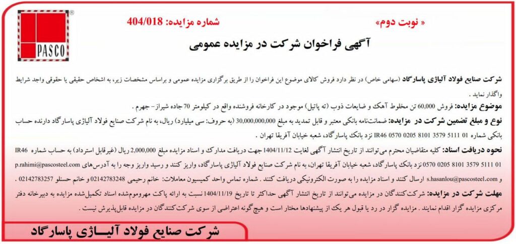 به گزارش پترومتالز، شرکت صنایع فولاد آلیاژی پاسارگاد در نظر دارد فروش ضایعات غیر تولیدی موجود در کارخانه فروشنده را از طریق برگزاری مزایده عمومی و بر اساس مشخصات زیر به اشخاص حقیقی یا حقوقی واجد شرایط واگذار کند. اطلاعات بیشتر را در تصویر فوق ببینید.