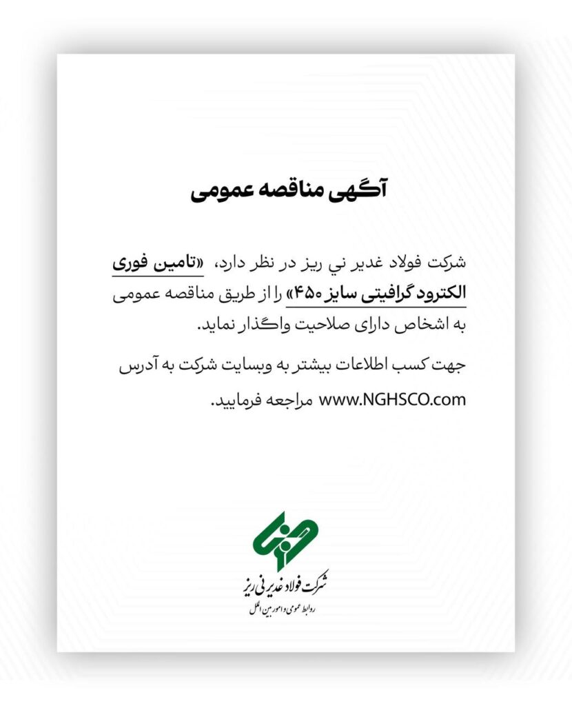 به گزارش پترومتالز، شرکت فولاد غدیر نی ریز در نظر دارد تامین فوری الکترود گرافیتی سایز ۴۵۰ را از طریق مناقصه عمومی به اشخاص دارای صلاحیت واگذار نماید. متقاصیان واجد شرایط می توانند جهت کسب اطلاعات بیشتر به درگاه مزایده و مناقصه به آدرس (اینجا) مراجعه نمایند.