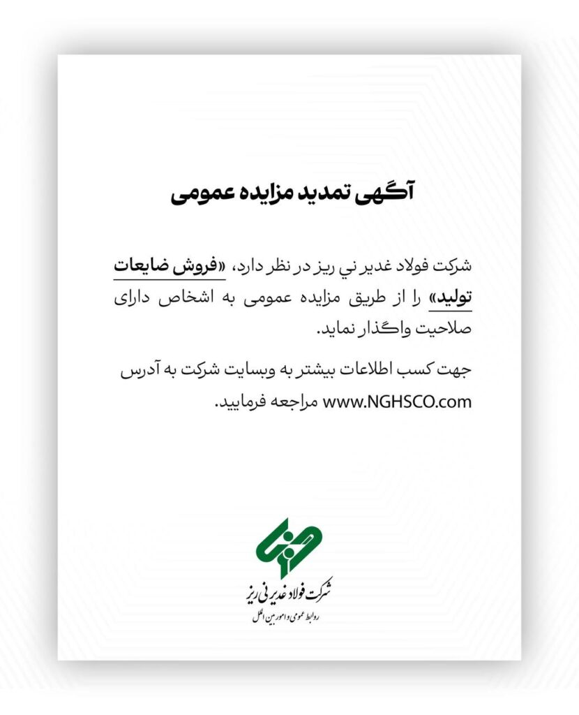 به گزارش پترومتالز، شرکت فولاد غدیر نی ریز در نظر دارد فروش ضایعات تولید را از طریق مزایده عمومی به اشخاص دارای صلاحیت واگذار نماید. متقاصیان واجد شرایط می توانند جهت کسب اطلاعات بیشتر به درگاه مزایده و مناقصه به آدرس (اینجا) مراجعه نمایند.