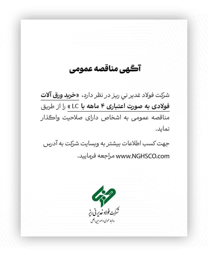 به گزارش پترومتالز، شرکت فولاد غدیر نی ریز در نظر دارد خرید ورق آلات فولادی به صورت اعتباری ۴ ماهه با LC را از طریق مناقصه عمومی به اشخاص دارای صلاحیت واگذار نماید. متقاصیان واجد شرایط می توانند جهت کسب اطلاعات بیشتر به درگاه مزایده و مناقصه به آدرس (اینجا) مراجعه نمایند.
