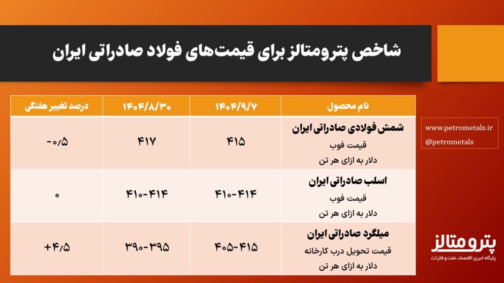 شاخص پترومتالز برای قیمتهای فولاد صادراتی ایران در هفته منتهی به ۱۶ آبان ۱۴۰۴ منتشر شد. در این هفته، قیمت فوبِ شمش فولادی صادراتی ایران تغییری نداشت و ۴۱۶ تا ۴۲۰ دلار به ازای هر تن بود. معامله خاصی در بازار شمش فولادی صادراتی ایران در این هفته صورت نگرفت. قیمت فوب شمش فولادی صادراتی از […]