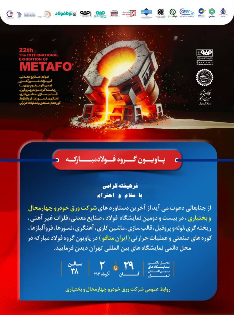به گزارش پترومتالز، انجمن تولیدکنندگان فولاد آلیاژی بهعنوان تشکلی که پیشرفتهترین بخش زنجیره فولاد ایران را نمایندگی میکند، در بیست و دومین نمایشگاه بینالمللی ایران متافو حضوری فعال خواهد داشت. از فعالان صنعت آهن و فولاد و صنایع وابسته دعوت میشود تا از غرفه انجمن فولاد آلیاژی در این نمایشگاه واقع در سالن 38B، غرفه E08 […]