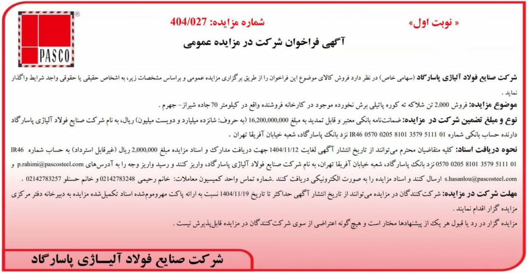 به گزارش پترومتالز، شرکت آهن و فولاد ارفع در نظر دارد مقدار ۳،۰۰۰ تن سرباره کوره پاتیلی (LF) خود را از طریق مزایده و به بالاترین قیمت پیشنهادی به فروش برساند. متقاضیان شرکت در مزایده می توانند از تاریخ ۱۴۰۴/۰۴/۲۲ لغایت ۱۴۰۴/۰۴/۳۱ به آدرس اینترنتی 4953=arfasteel.com/?p و یا در ساعات اداری به دفتر مرکزی شرکت به […]