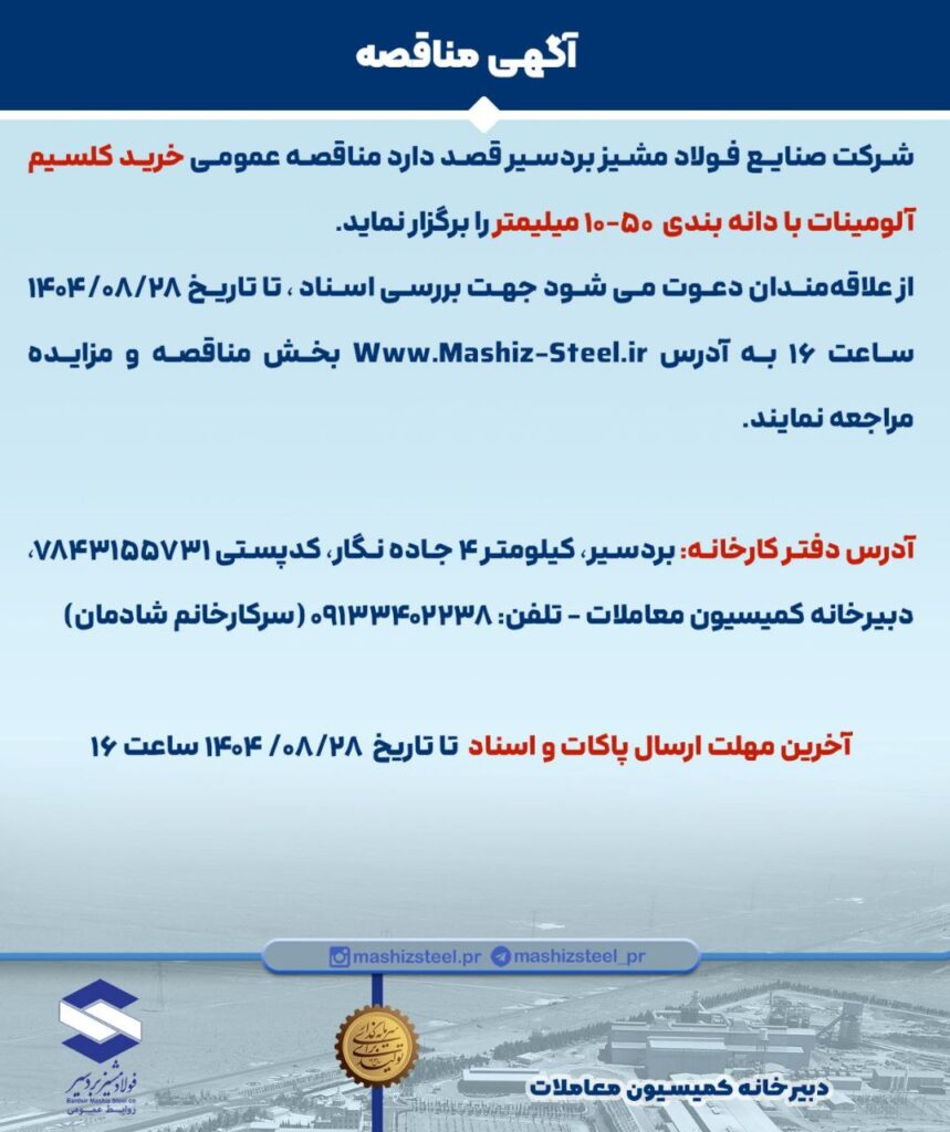 به گزارش پترومتالز، شرکت صنایع فولاد مشیز بردسیر قصد دارد مناقصه عمومی خريد كلسيم آلومينات با دانه بندی 50-10 ميليمتر را برگزار نماید. این شرکت از علاقهمندان دعوت کرد جهت بررسی اسناد، تا تاریخ 28/08/1404 ساعت 16 به آدرس Www.Mashiz-Steel.ir بخش مناقصه و مزایده مراجعه نمایند. آدرس دفتر کارخانه: بردسیر، کیلومتر 4 جاده نگار، کدپستی […]