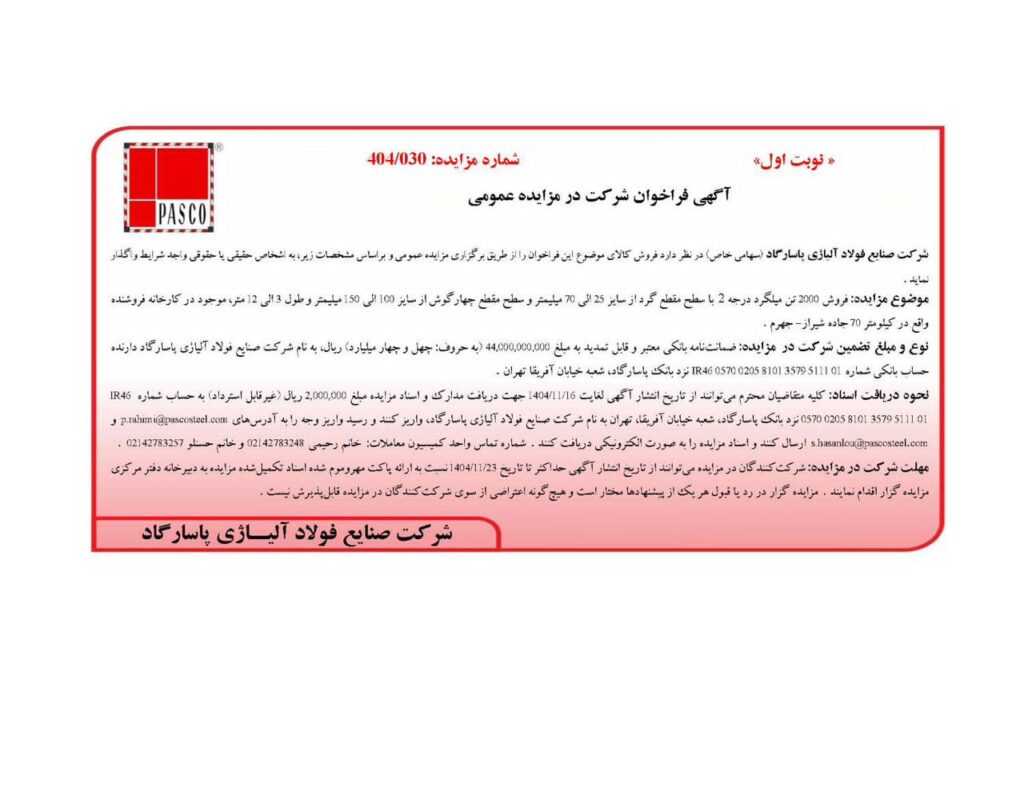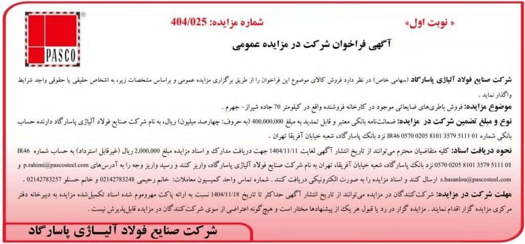 فراخوان مزایده فروش باطری‌های ضایعاتی توسط شرکت صنایع فولاد آلیاژی پاسارگاد