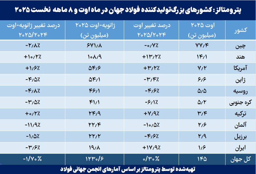 به گزارش پترومتالز، بر اساس تازهترین آمار انجمن جهانی فولاد که امروز چهارشنبه دوم مهر منتشر شد، در ماه اوت ۲۰۲۵، ایران با تولید ۱٫۶ میلیون تن فولاد خام توانست رشدی قابل توجه معادل ۱۷٫۹ درصد نسبت به مدت مشابه سال قبل ثبت کند. این عملکرد، ایران را در میان ۱۰ کشور بزرگ فولادساز جهان […]