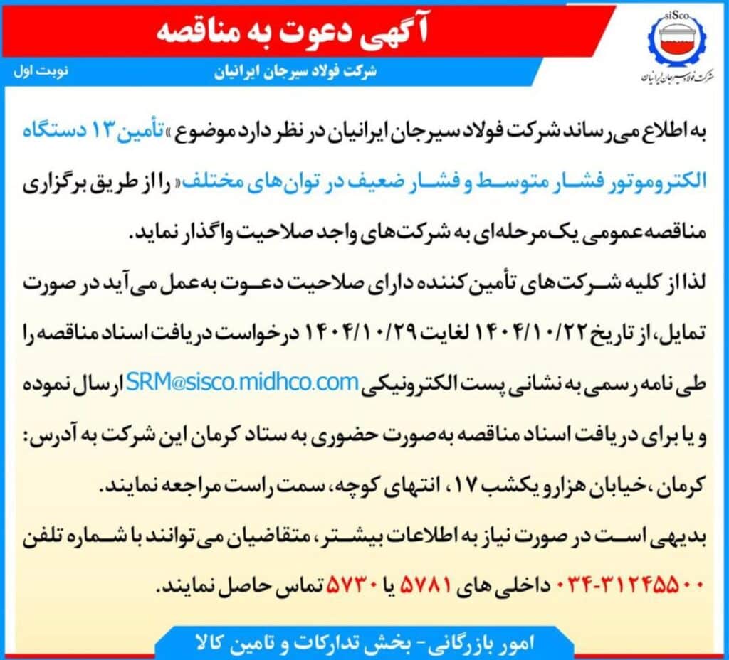 به گزارش پترومتالز، شرکت فولاد سیرجان ایرانیان در نظر دارد موضوع تأمین 13 دستگاه الکتروموتور فشار متوسط و فشار ضعیف در توانهای مختلف را از طریق برگزاری مناقصه عمومی یکمرحلهای به شرکتهای واجد صلاحیت واگذار کند. این شرکت از کلیه شرکتهای تأمینکننده دارای صلاحیت دعوت به عمل آورد در صورت تمایل، از تاریخ 22/10/1404 لغایت 29/10/1404 […]