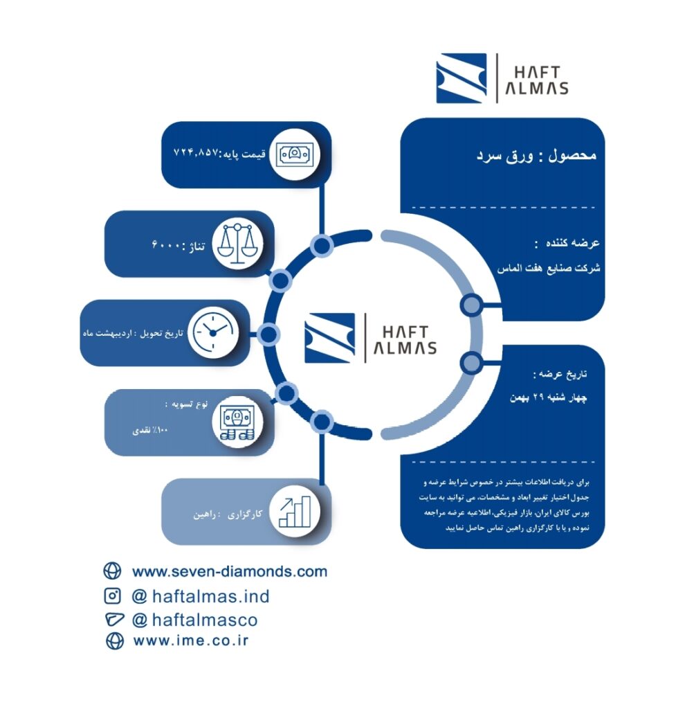 به گزارش پترومتالز، سهشنبه ۷ مرداد ماه ۴ هزار تن ورق سرد شرکت صنایع هفت الماس در بورس کالا عرضه می شود. جزییات این عرضه به شرح زیر است: ۴۰۰۰ تن ورق سرد تاریخ تحویل: شهریور ماه ۱۴۰۴ قیمت پایه ورق سرد: ۴۰۹٫۰۷۳ ریال تسویه: (۰.۵ درصد نقدی و ۹۹.۵ درصد ال سی دو ماهه […]
